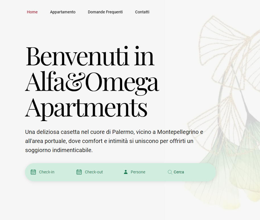 Questo sito web WordPress è stato creato per gestire le prenotazioni del B&B Alfa & Omega Apartments in modo pratico e veloce. Con un design versatile e intuitivo, consente all'host di gestire autonomamente i propri annunci e le prenotazioni. Gli utenti possono facilmente verificare la disponibilità, prenotare online e trovare informazioni utili sulle attrazioni locali e i servizi offerti. Il sito è ottimizzato per fornire un'esperienza utente fluida e accessibile, facilitando sia la gestione interna che la fruizione da parte dei visitatori.